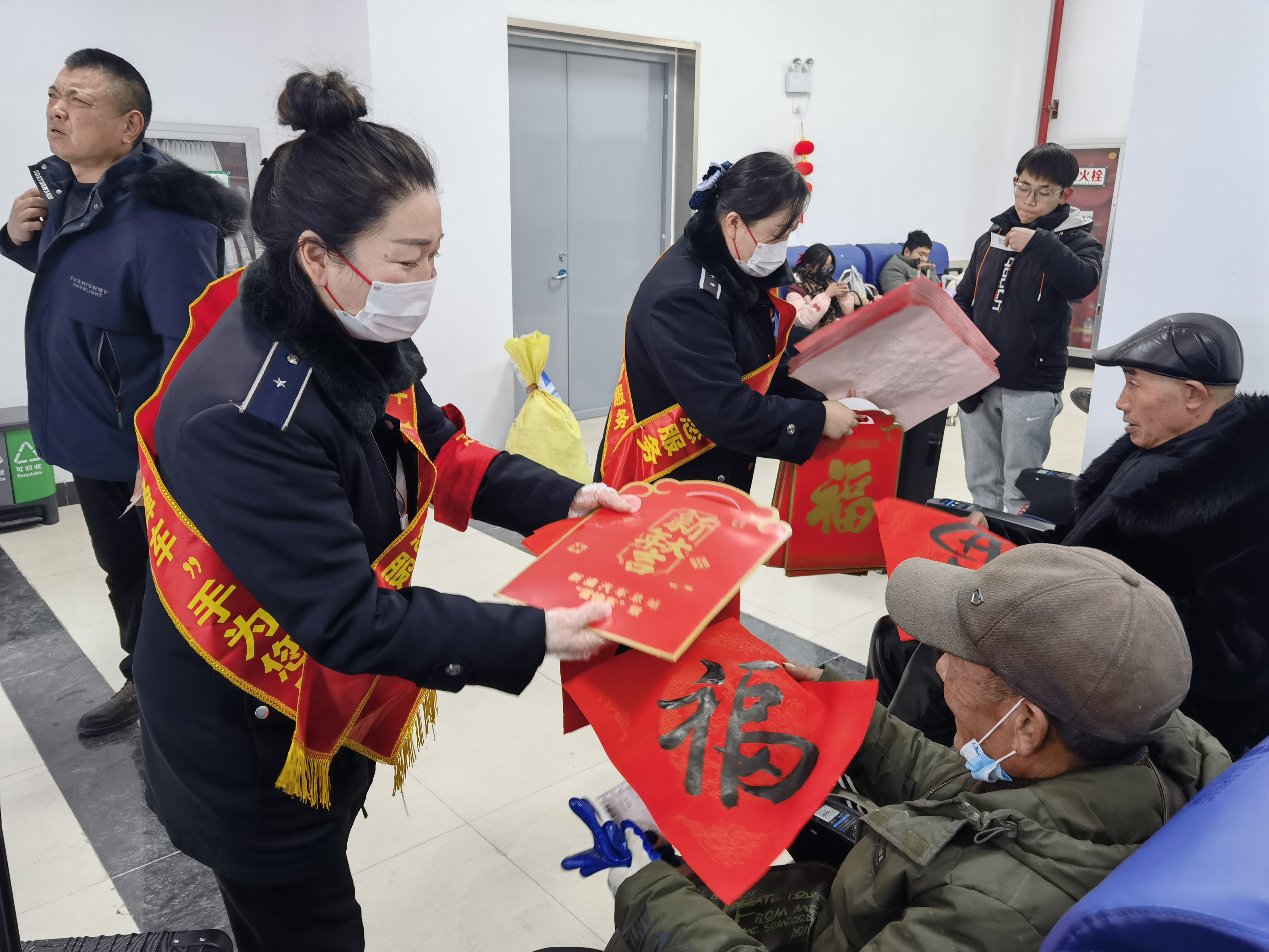 新浦汽车总站候车厅和驿站悬挂着红色灯笼和拉花,营造了浓厚节日氛围,让人感受到浓浓的年味,更让旅客感受到家的温暖。上午九点,总站候车厅、驿站门前的“雷锋车”组志愿服务台上摆满了对联和“福”字,“雷锋车”们向旅客分发对联和“福”字,为他们送上了新春的祝福。接过对联和“福”字的旅客纷纷表示感谢,也把新春祝语送给了“雷锋车”们。
