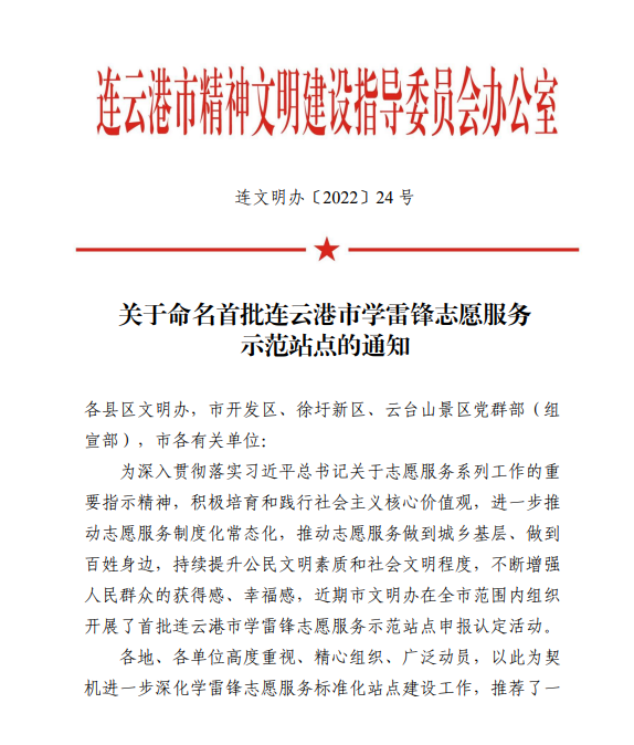 针对此次命名,连云港市文明办强调各站点要充分发挥学雷锋志愿服务示范站点的示范引领作用,在推动志愿服务制度化、规范化、常态化上下功夫,大力培育志愿服务文化,不断提升公民道德素质和社会文化程度,为推动新时代的“后发先至”、建设人民期待的现代化新港城凝聚强大精神力量。