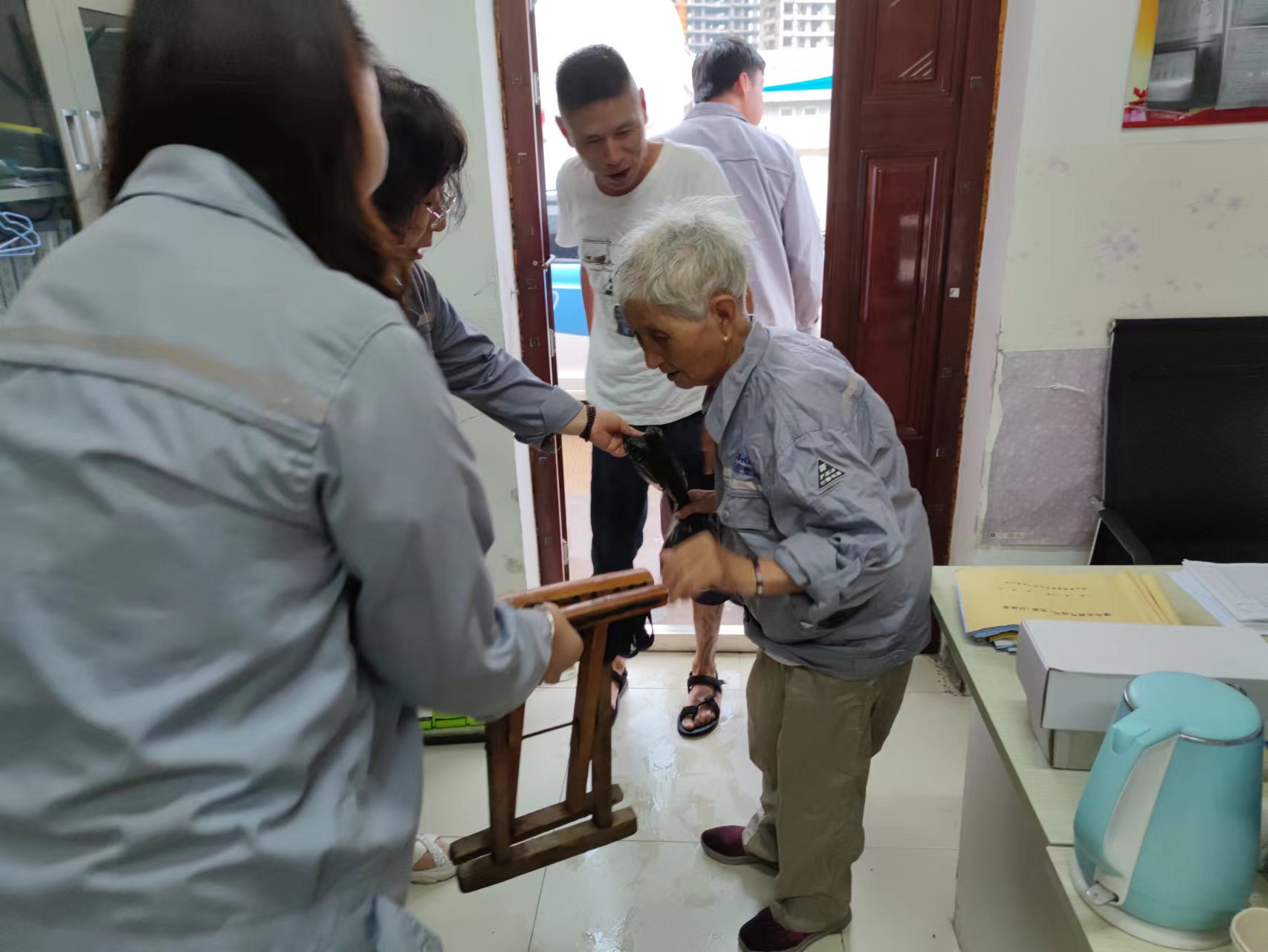 7月28日下午三点左右,原本晴朗的天空顷刻间乌云密布,紧接着就下起了瓢泼大雨。这时,正在加气机旁检查设备的宋晨歌看到站外有一位身形瘦小的老奶奶,手里拿小马扎,顶着风雨艰难地挪动脚步,浑身衣服都已湿透。宋晨歌立马飞奔过去,接过老奶奶的小马扎,将老人搀扶进办公室躲雨。加气站的同事们看见冻得瑟瑟发抖的老人,立刻找了一身干爽舒适的工作服给老人换上,递上热水和食物让她暖暖身体。通过耐心询问,得知老人原本是出来遛弯的,没想到突然就下起了大雨,家里亲人电话也不记得,只知道儿子的名字。