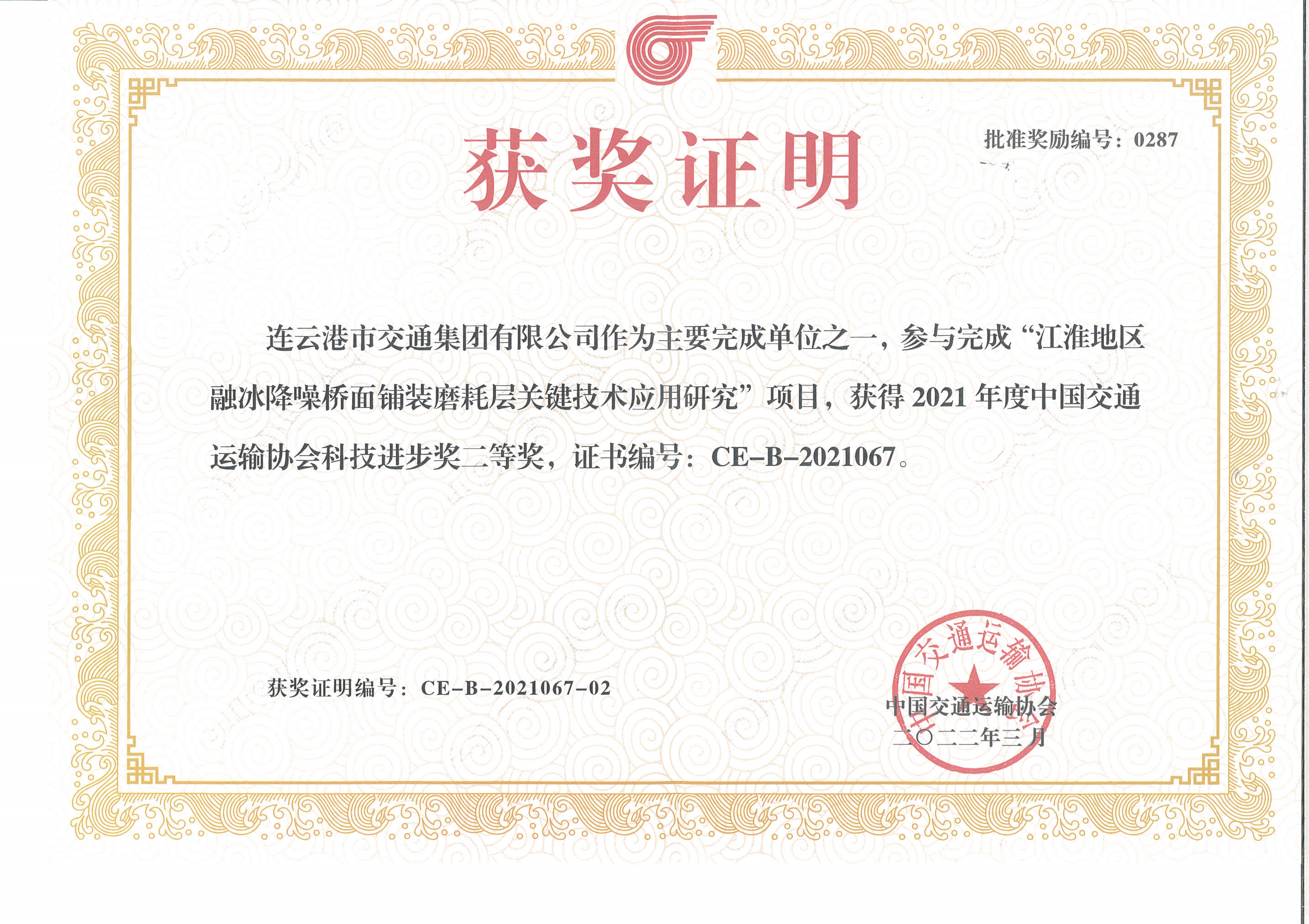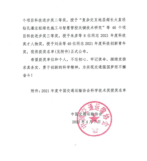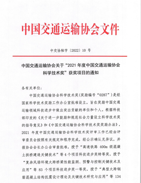 近日,中国交通运输协会发布了“2021年度中国交通运输协会科学技术奖”获奖项目名单,交通云博app最新版下载,云博(中国)联合苏交科云博app最新版下载,云博(中国)等单位申报的“江淮地区融冰降噪桥面铺装磨耗层关键技术应用研究”项目荣获中国交通运输协会科技进步奖二等奖。