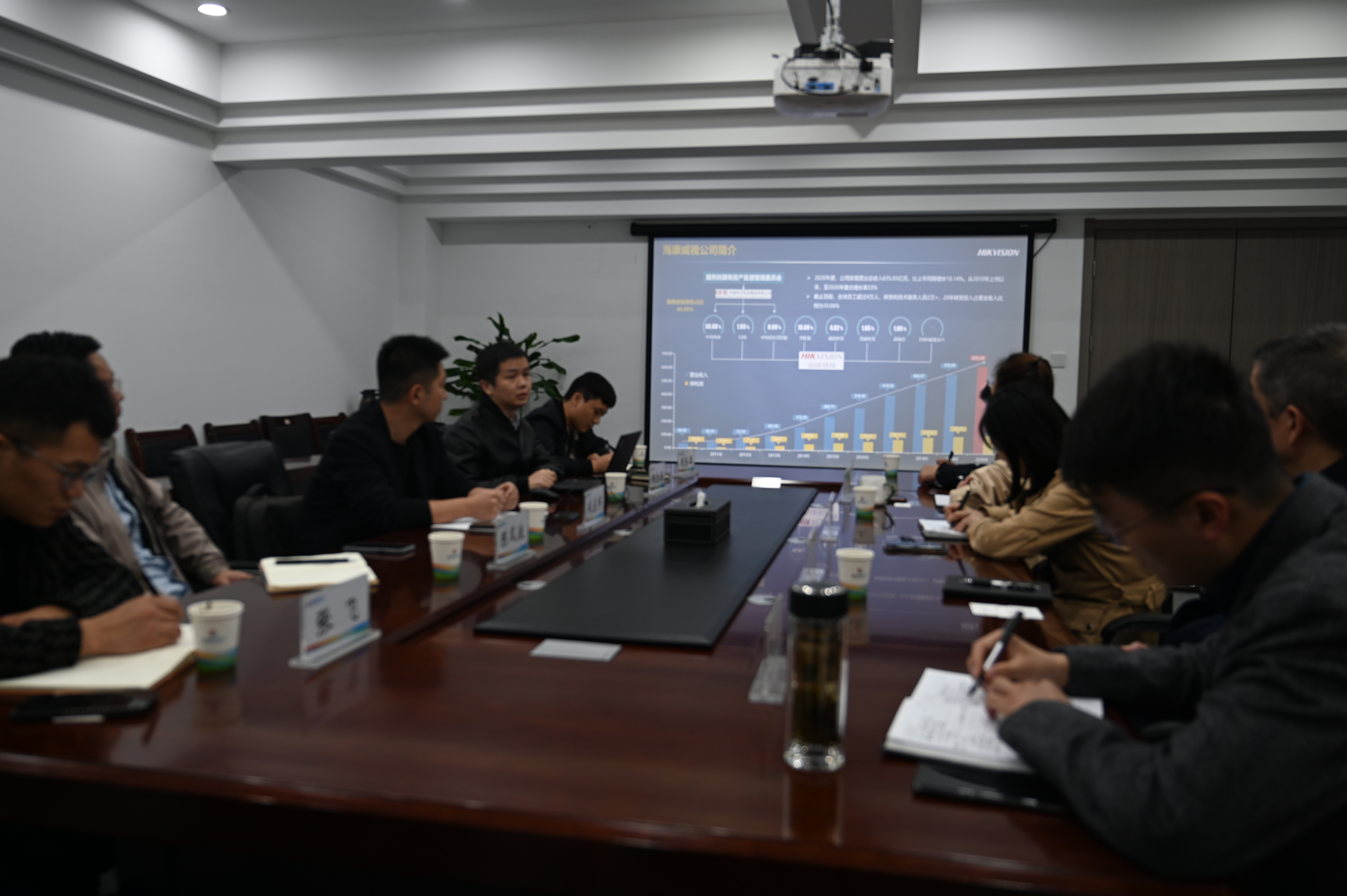 118日,海康威视数字技术股份有限公司市场部总监咸东辉、产品总监陈志强、投资部总监刘志国、连云港分公司总经理陈风浪一行来到市民卡公司进行智慧停车项目的交流座谈,市民卡公司党支部书记、总经理叶星妍、副总经理朱晓雯参加会议。