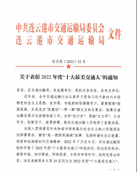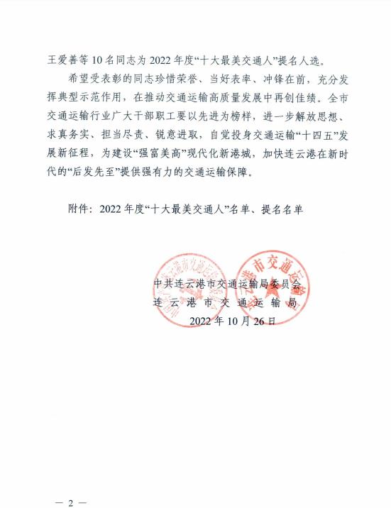 为深入贯彻落实中央和省市培育践行社会主义核心价值观系列部署要求,擦亮“美·德照亮港城”品牌,弘扬传递社会正能量,培育和弘扬新时代交通精神,2022年7月至9月,市交通运输局组织开展了2022年度“十大最美交通人”评选活动。经过宣传发动、推荐申报、初评筛选、网络投票、专家评审等环节,汽车公司客车驾驶员杨启华勇于担当、无私奉献,为推动交通运输高质量发展做出了积极贡献,荣获连云港市2022年度“十大最美交通人”。