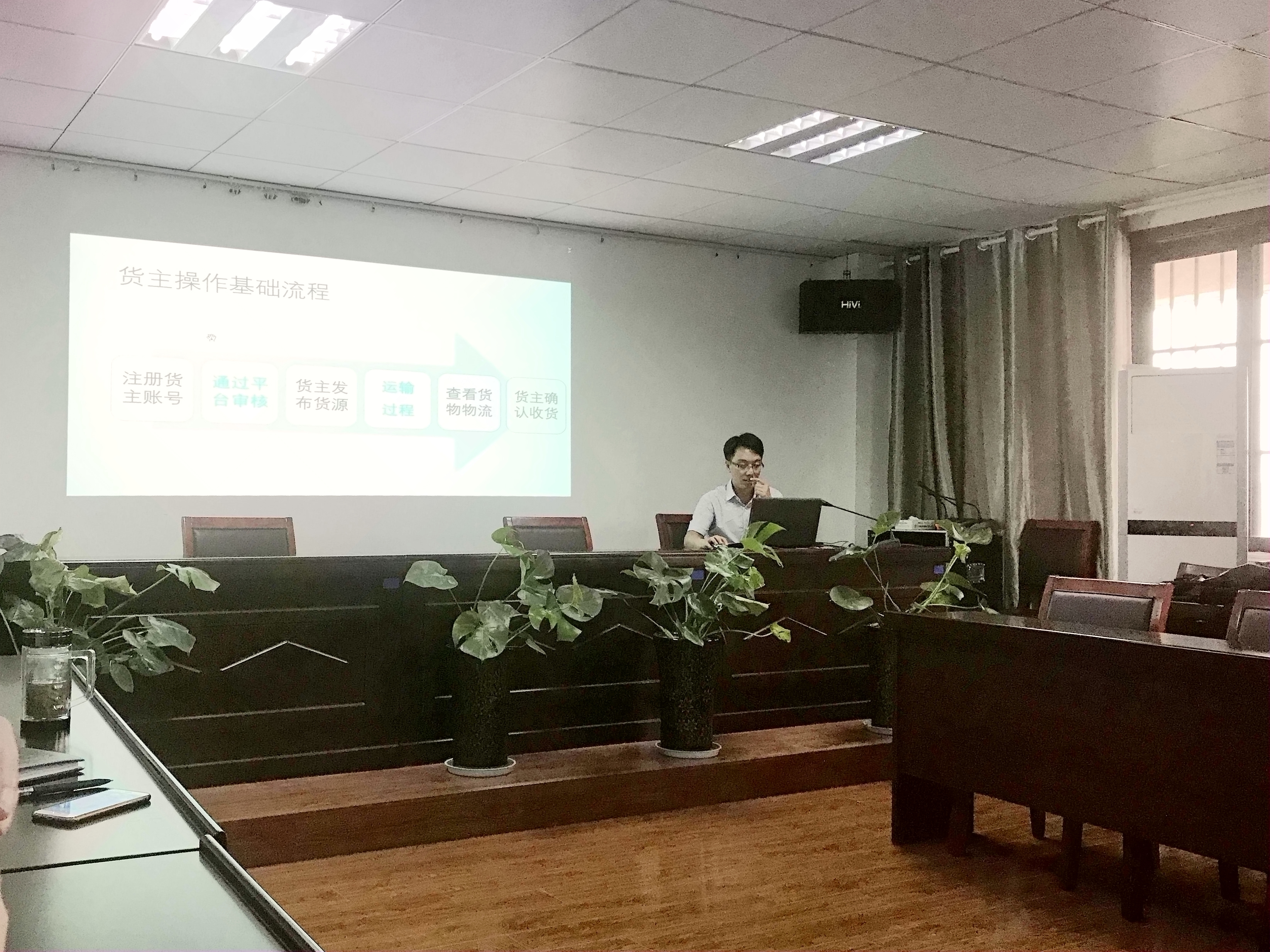 9月4日,公司与淮海工学院共同研发的“慧海通”物流云数据平台项目在公司东四楼会议室进行了阶段性成果演示,公司领导班子成员、企管处、市场部及相关运输单位负责人参加了平台项目的模拟演示。