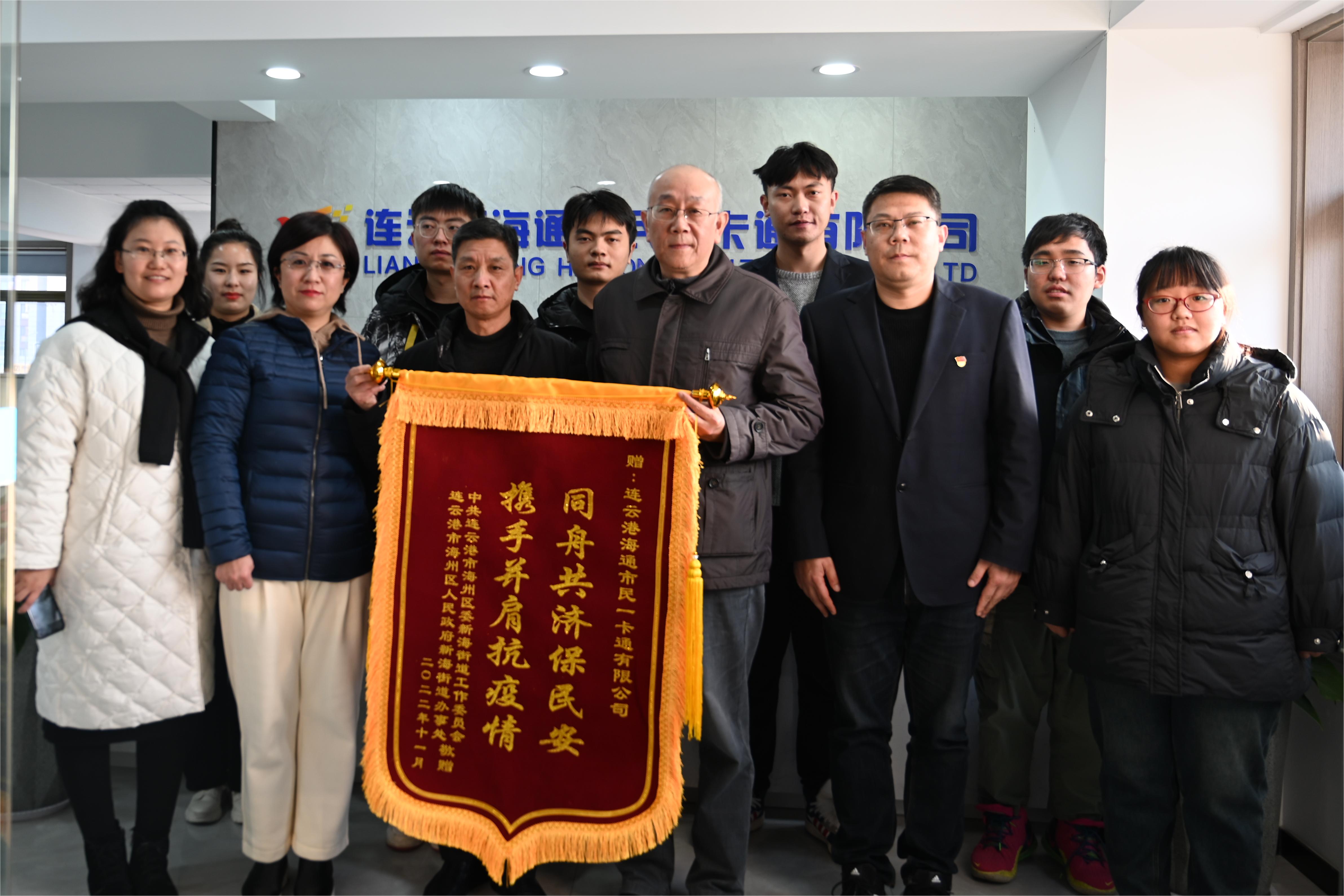 12月7日下午,市新海街道党委书记汪立岳协同富强社区社区书记赵云来到连云港海通市民一卡通有限公司,将一面印有“同舟共济保民安,携手并肩抗疫情”的锦旗,送至市民卡公司工会主席王冰和全体志愿者手中,感谢他们在疫情防控期间对富强社区居民的辛勤劳动和无私奉献。