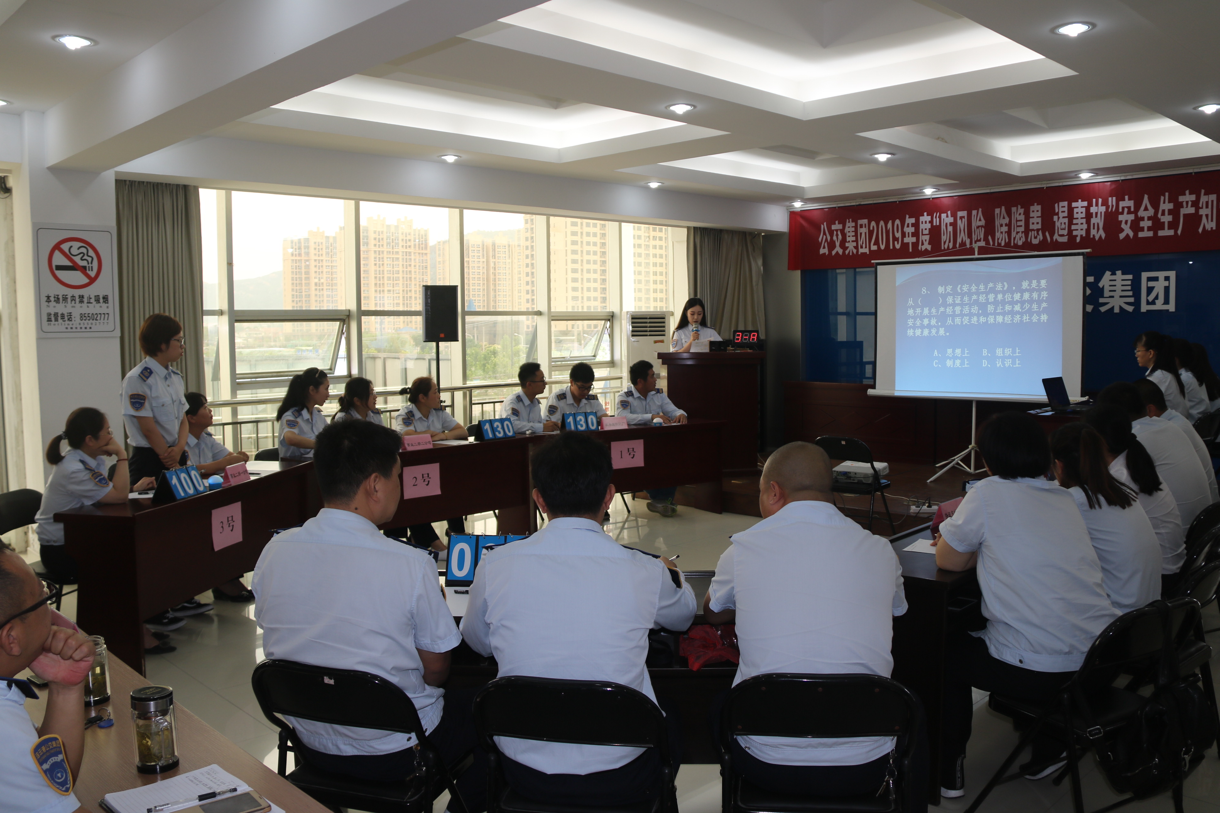此次竞赛内容涵盖了《中华人民共和国安全生产法》《中华人民共和国道路交通安全法》《中华人民共和国道路交通安全法实施条例》《江苏省安全生产条例》等安全生产法律法规知识点。竞赛分为预赛、决赛两个阶段,参赛小组以分公司为单位,每分公司选派三名选手参加比赛,14个分公司在预赛中通过笔试形式,按各队总分的高低选出6支队伍进入决赛。