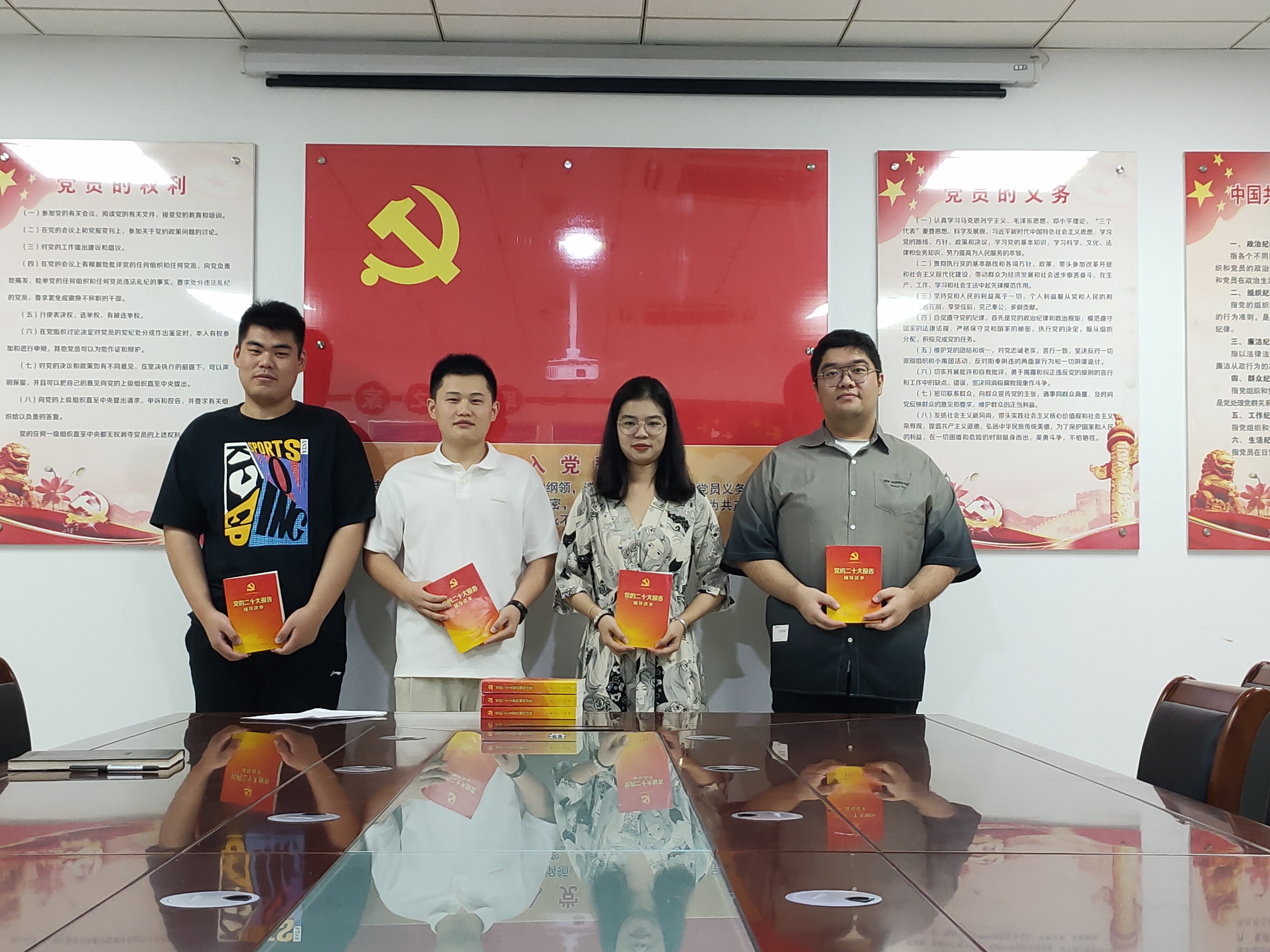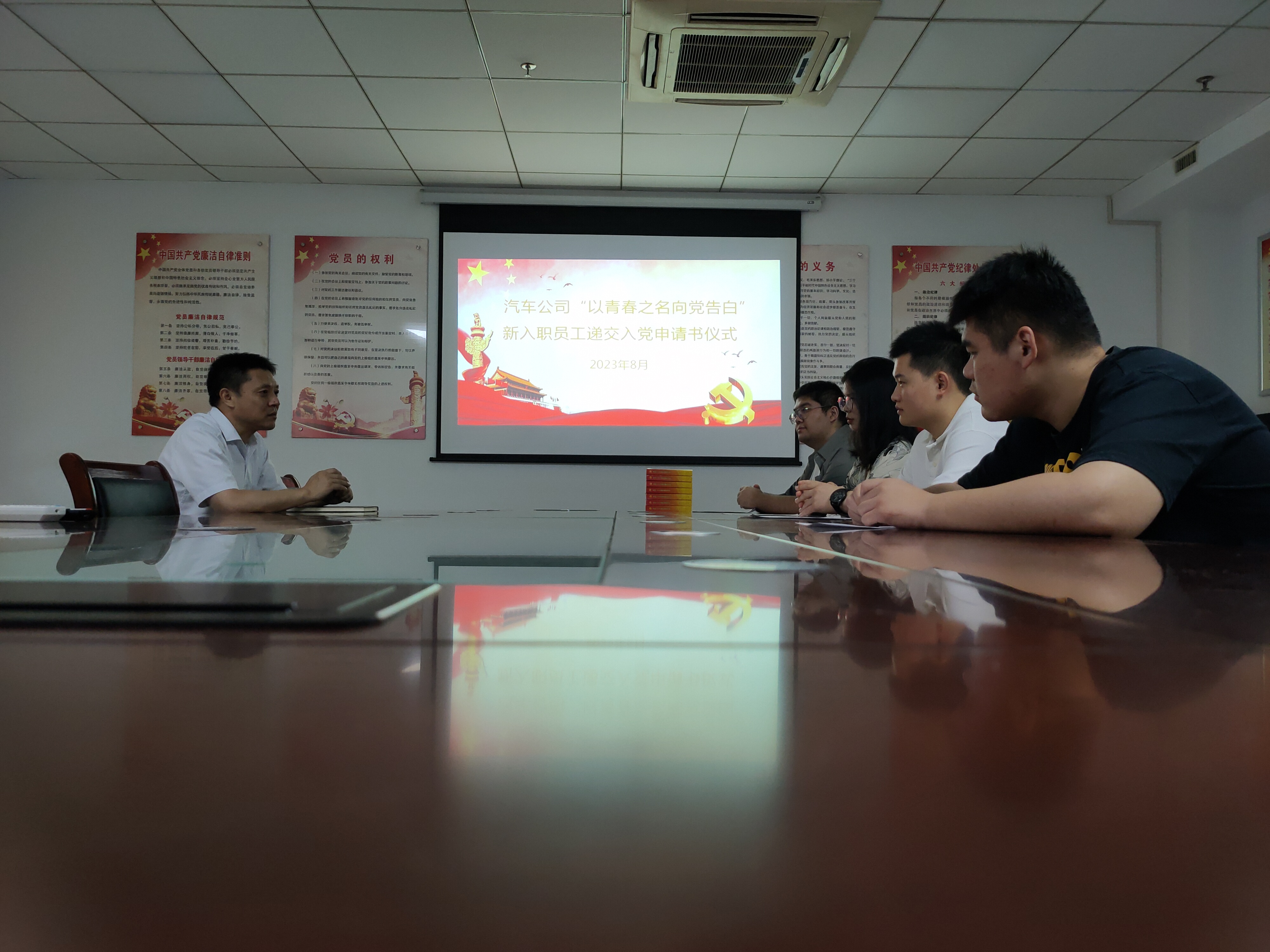 “起来,饥寒交迫的奴隶……”伴随着雄壮有力的《国际歌》,新入职的4名青年员工向党组织递交了入党申请书,通过谈入党动机和对党的认识,向党组织表达了入党愿望和决心。每一封字迹工整的入党申请书,无一例外表达了青年们渴望入党的迫切心情。
